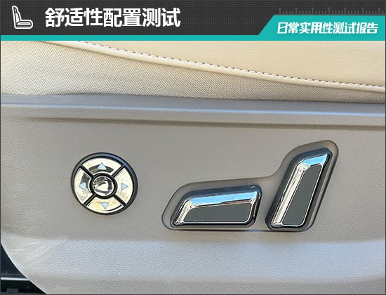 座椅方面,评测车前排座椅调节按键位于座垫侧面,调节按键位置合理,操作便捷。此外,评测车驾驶位座椅支持记忆功能;同时,前排座椅提供加热和通风功能,舒适性表现较好。