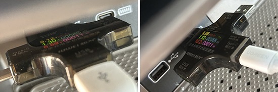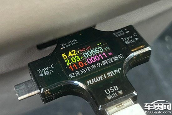 此外,我们对USB接口进行了测试。其中,前排USB Type-A接口充电功率为6.69W,电压为5.12V,电流为1.3A;USB Type-C接口的充电功率为10.2W,电压为9.05V,电流为1.12A。后排USB Type-A接口的充电功率为11W,电压为5.42V,电流为2.03A。