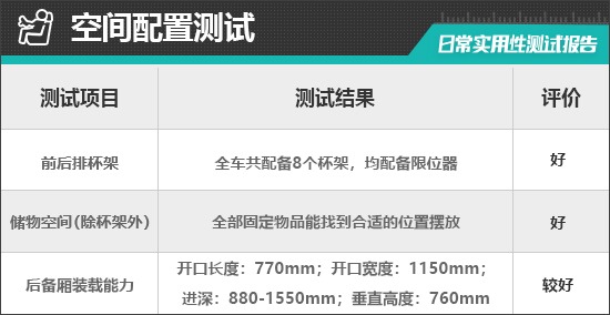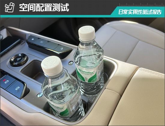 经过实测,全部固定物品均有合适的储物空间进行摆放,并且位置设计比较合理,拿放物品方便。同时,评测车不仅在中控台下方设有较大空间的储物槽,杯架前方的小储物槽还非常适合存放随手携带的小物品;此外,副驾驶前方还设有一个储物槽,进一步提升了实用性。