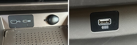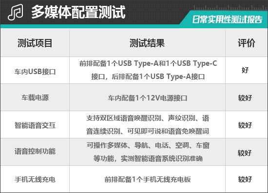 评测车共配备3个USB接口,其中,前排配备1个USB Type-A接口和1个USB Type-C接口,后排配备1个USB Type-A接口。同时,前排还配备1个12V电源接口,能够满足车内乘客多种电子设备的用电需求。