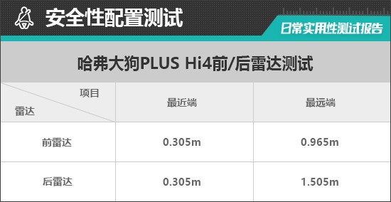 前雷达最远可以在0.965m处感应到前方物体,雷达功率表现一般;最近端感应距离为0.305m,表现同样未达到同级别车型平均水平。