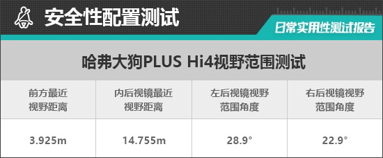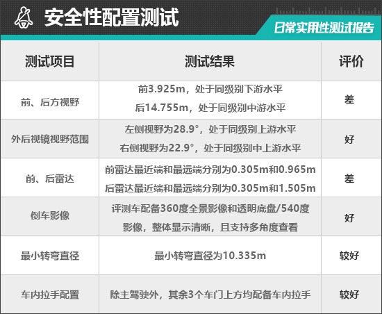 在车辆前、后方视野测试中,车内所有座椅均已调整至最低状态,所测出的数据与驾驶者正常使用时均有一些偏差,仅供参考。