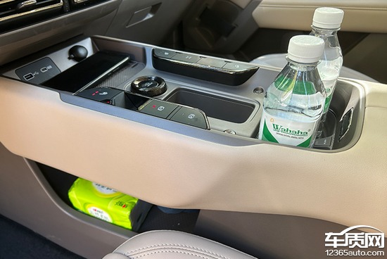 评测车前排杯架前方配备了1个手机无线充电板,位置设计合理,驾驶员拿放手机方便。充电功率为50W,提供通风散热口和开启/关闭功能,实用性不错。