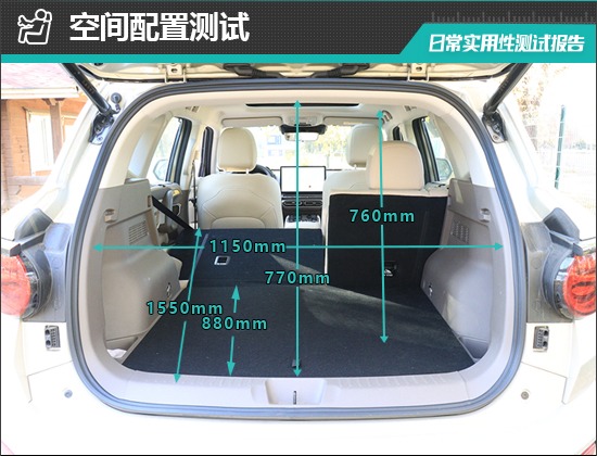 后备厢内部造型较为规整,地板平整度不错。后排座椅按比例放倒后,可以进一步拓展后备厢空间。对于评测车后备厢的基础数值,我们也进行了实测,开口长度为770mm;开口宽度为1150mm;后备厢进深为880-1550mm;后备厢地台与顶部的垂直高度为760mm。