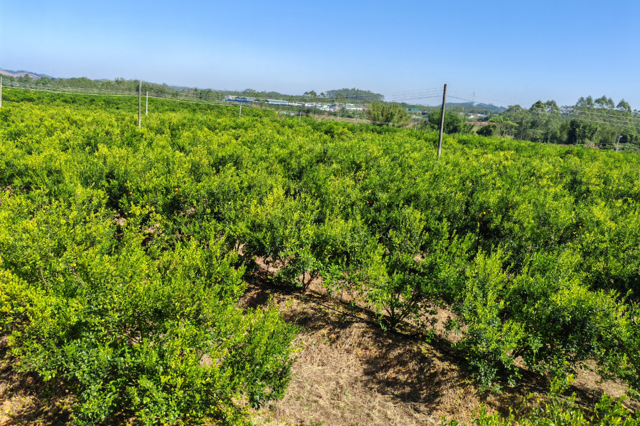 茶枝柑,又名新会柑,作为“广东三宝”之首陈皮的正宗原料,是药食同源的佳品,其果皮制成的陈皮是十大广药之一,兼具食疗保健与茶道怡情的文化特质。近年来,随着陈皮价值日益凸显,茶枝柑市场价格逐年攀升,种植规模持续扩大。鸿牛农业深谙产业发展的核心在于技术,于是与广东省农业科学院果树研究所达成产学研合作,共建“茶枝柑新品种新技术试验示范基地”,将“宽行窄株高垄”种植新模式、无病容器苗培育、水肥一体化智能灌溉、地布覆盖免耕管理及病虫害绿色精准机械化防控等关键技术尽数落地田间。如今,公司已累计投入300多万元,在和平村及邻村整合盘活土地1000亩,种植茶枝柑近10万棵,成功实现“一年成园、两年结果、三年丰产”的目标,打造出品种优质化、防控绿色化、水肥智能化的现代示范园。